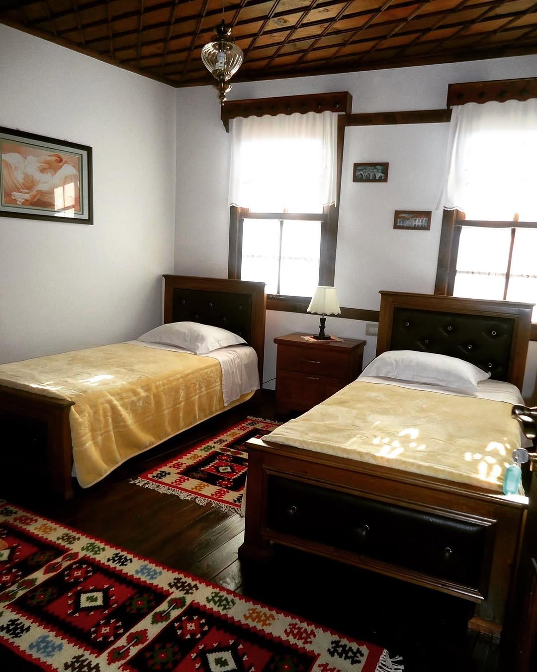 Le camere di Hotel Klea Berat sono semplici ma accoglienti, pulite e arredate in stile tradizionale. I dettagli artigianali, il legno e le viste dalle finestre donano carattere a ogni stanza. Non è lusso, ma è autenticità pura.