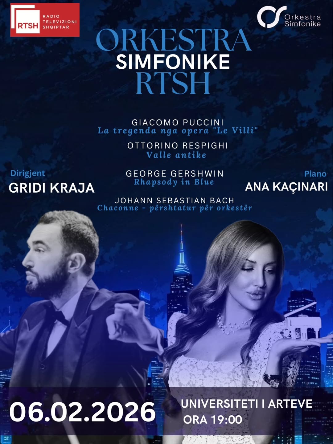 Një mbrëmje klasike me Orkestrën Simfonike të RTSH-së, nën drejtimin e dirigjentit Gridi Kraja dhe me solisten e mirënjohur Ana Kaçinari në piano. Programi përfshin vepra të mëdha nga Puccini, Respighi, Gershwin, dhe Bach. Ky koncert ofron një përzierje të emocioneve, virtuozitetit dhe elegancës në një nga sallat më prestixhioze të kryeqytetit.