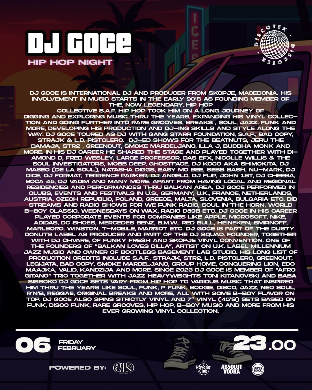 Discotek rikthehet me një mbrëmje të fuqishme hip-hop nën ritmet e DJ Goce! Të premten, kjo hapësirë energjike në zemër të Tiranës shndërrohet në një pistë kërcimi plot atmosferë, ku ritmet e shpejta dhe beat-et e forta do t’ju mbajnë në lëvizje deri në orët e vona. Një arratisje perfekte urbane për adhuruesit e muzikës hip-hop, DJ Goce premton ta mbajë publikun ndezur me setin e tij unik.