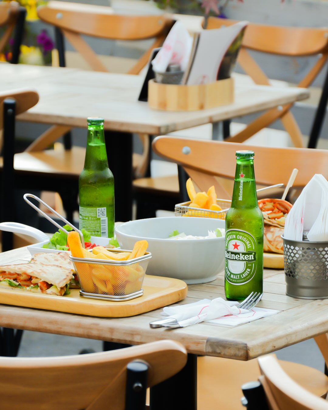 Menuja përfshin një gama të gjerë ushqimesh tipike greke, që nga gyros dhe souvlaki, te burgerët me prekje helene, pita-t me mish ose falafel, sallatat e freskëta mesdhetare dhe ëmbëlsira si loukoumades me mjaltë apo Nutella. Ushqimet shoqërohen me salca tradicionale si tzatziki dhe tirokafteri, dhe çdo pjatë ndërtohet për të ofruar një përvojë të shijshme, të shpejtë dhe vizualisht tërheqëse. Atmosfera është e gjallë dhe moderne, e kompletuar me menu dixhitale dhe ambiente të hapura në verë.