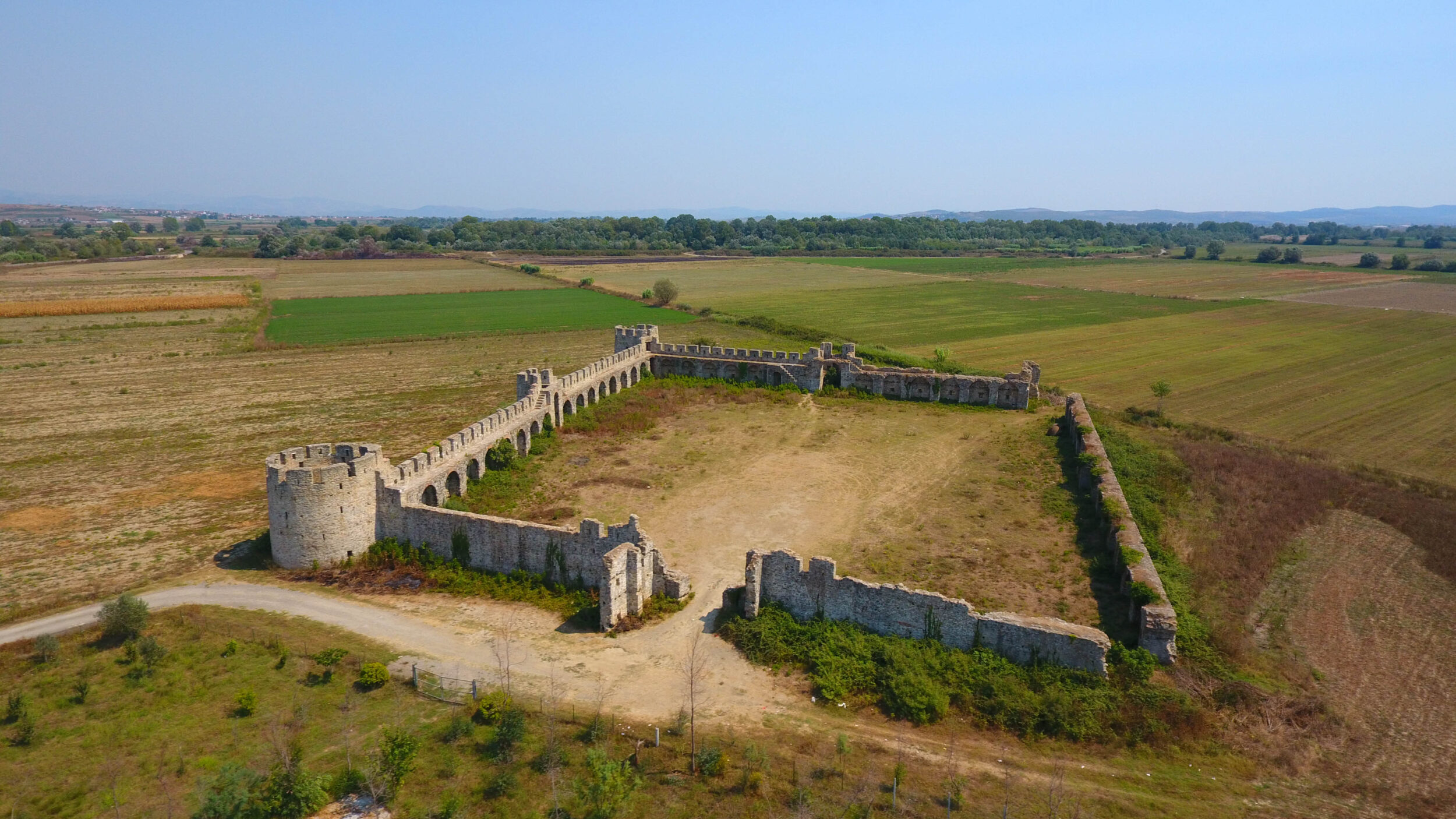 What makes it truly exceptional is its rare location and design. Unlike most castles in Albania, which dominate hilltops or mountain peaks, Vile Bashtova Castle rises from completely flat terrain—making it the only fortress of its kind in the Balkan region. Its rectangular shape and symmetrical layout create a sense of harmony, while the combination of medieval defensive walls with Roman-inspired arches reflects a unique blend of architectural influences shaped by different historical periods.